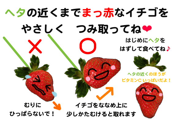・採ったイチゴを食べずにイチゴの葉陰や地面、草陰に置くのは止めてください