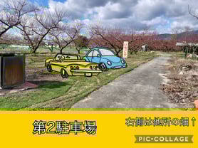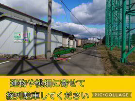建物や桃畑に寄せて縦列駐車してください。